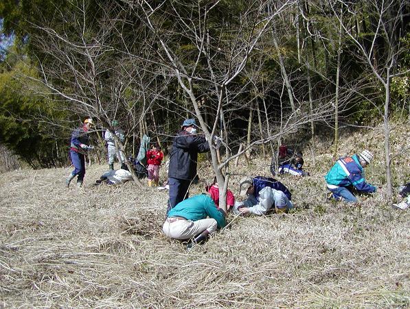 越冬幼虫探し(2002.2.23 榎の木の根元の落ち葉の裏側を探す)