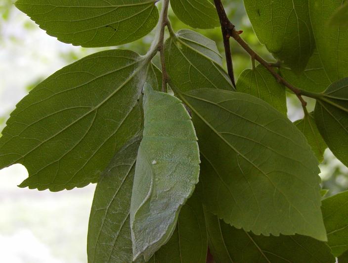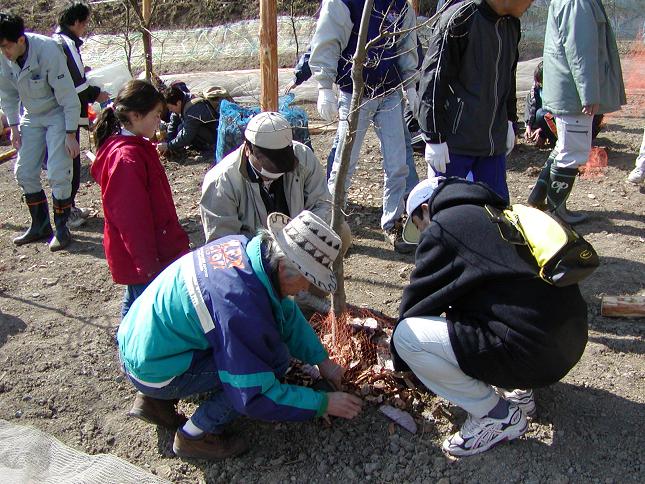 採取した幼虫を公園の榎の根元に放します。