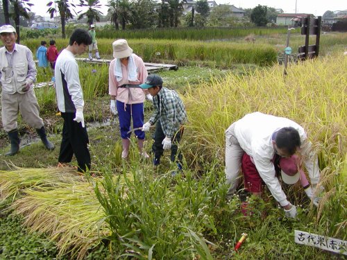 (古代米の稲刈りと脱穀・籾すりです)